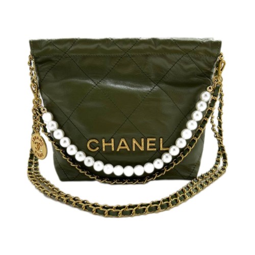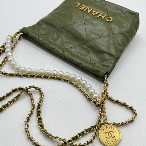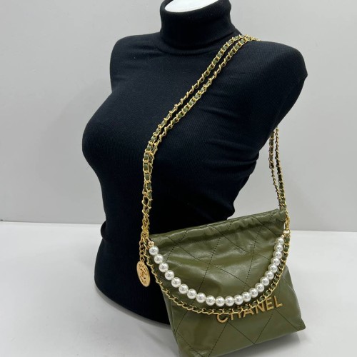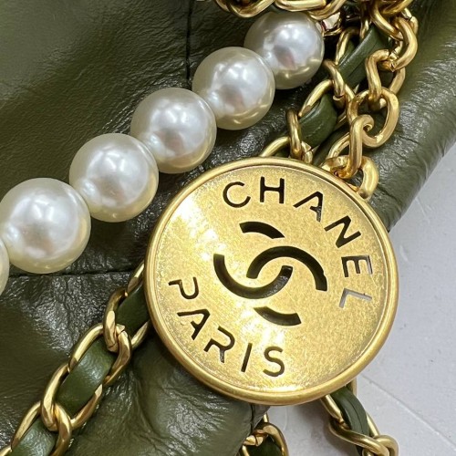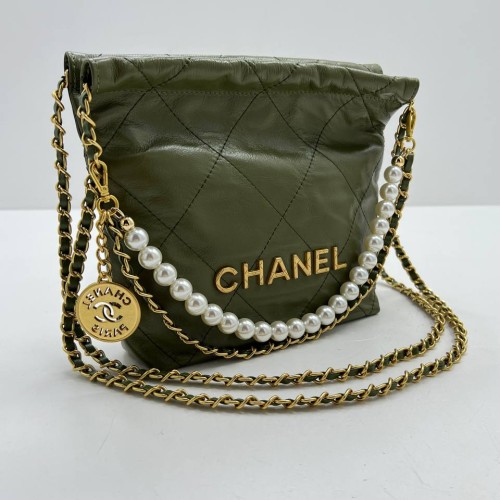 Зеленая сумка Chanel из натуральной кожи. Очаровательная модель станет идеальным дополнением к вашему образу. Аксессуар украшен жемчугом и фурнитурой золотистого оттенка. В нашем интернет-магазине вы можете купить копии сумок с доставкой по Москве и по всей России.