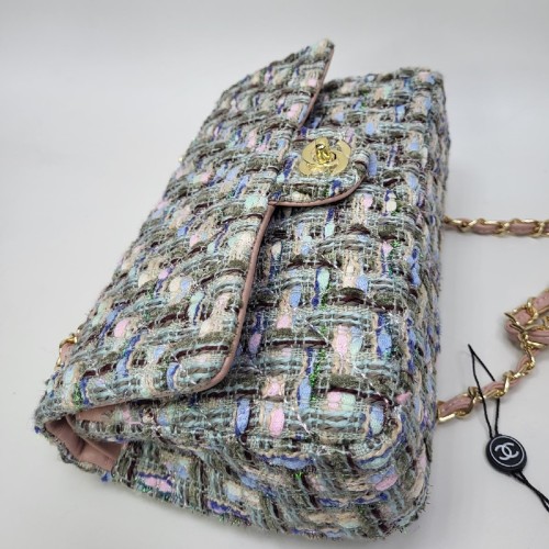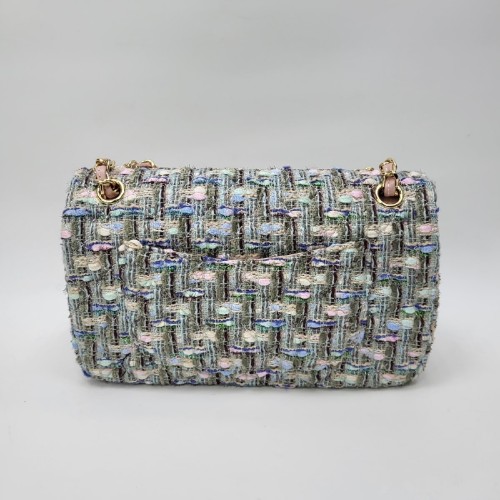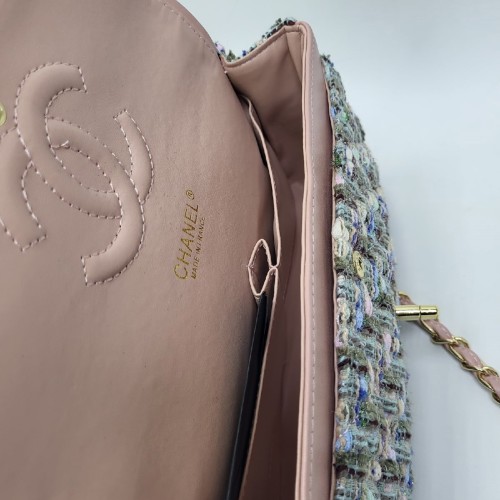 Зелено-голубая сумка Chanel из текстиля с отделкой натуральной кожей. Оригинальная и стильная модель сразу привлечет внимание. Комбинированный ремень, который состоит из цепочки, оплетенной кожаным шнуром, завершает дизайн аксессуара. В нашем интернет-магазине вы можете купить копии сумок с доставкой по Москве и по всей России.