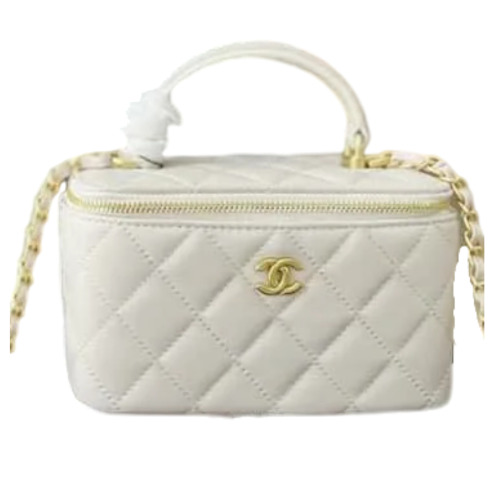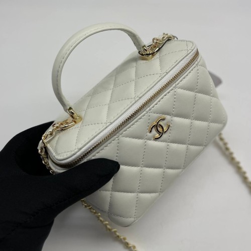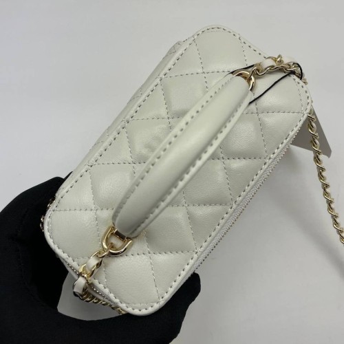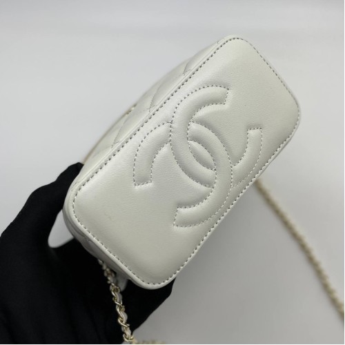 Белая сумка Chanel из натуральной кожи. Фурнитура золотистого цвета придает дизайну изящный акцент. Благодаря ручке аксессуар можно носить в руке, а плечевому ремню-цепочке — на плече и через плечо. В нашем интернет-магазине вы можете купить копии сумок с доставкой по Москве и по всей России.