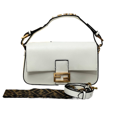 Белая сумка Fendi из натуральной кожи. Элегантный аксессуар дополнен фурнитурой золотистого цвета. Также в комплекте идет изящный твилли. В нашем интернет-магазине вы можете купить копии сумок с доставкой по Москве и по всей России.