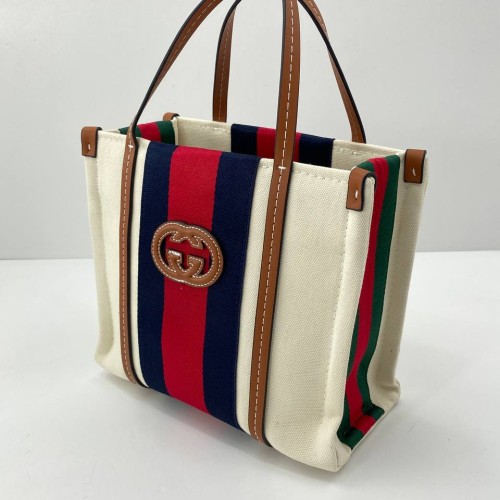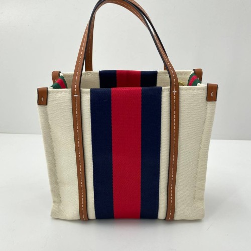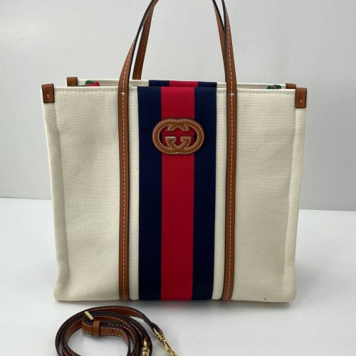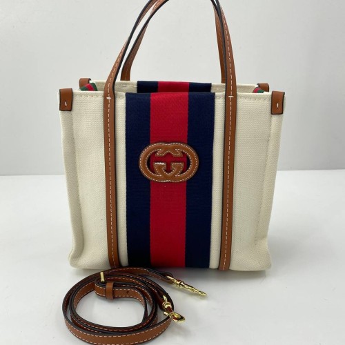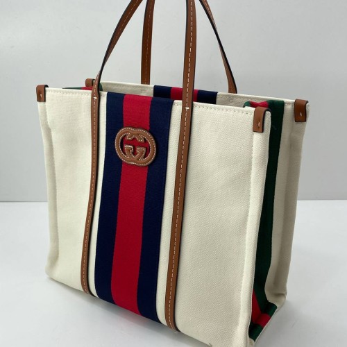 Сумка Gucci из текстиля и натуральной кожи, выполнена с белом, синем и красном цветах. Актуальная, в преддверии летнего сезона, вместительная сумка-шоппер. Она представлена в двух размерах, чтобы ваш выбор был еще приятнее и удобнее. В нашем интернет-магазине вы можете купить копии сумок с доставкой по Москве и по всей России.