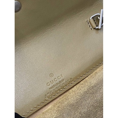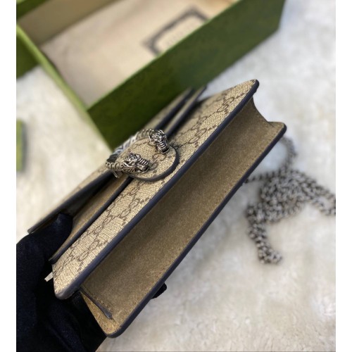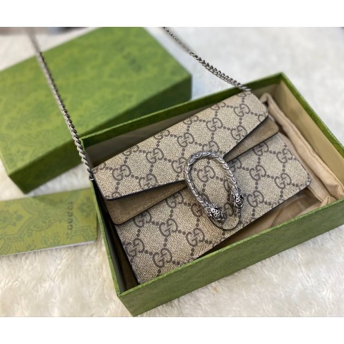 Бежевая сумка Gucci из канвы с отделкой из замшевой кожи. Застежка с тигриными головами украшает закрытие модели. Дизайн завершает плечевой ремень-цепочка длиной 60 см. В нашем интернет-магазине вы можете купить копии сумок с доставкой по Москве и по всей России.