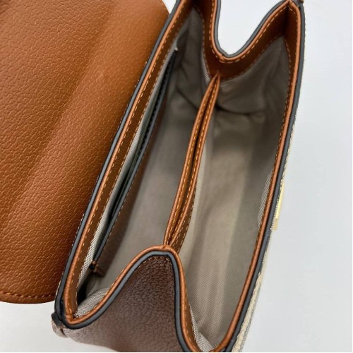 Сумка закрывается на клапан с металлическим замком. Внутри: два отделения, два плоских открытых кармана.