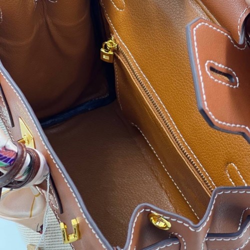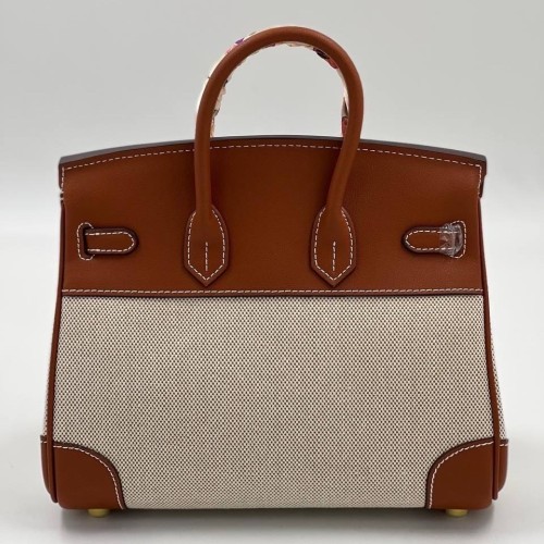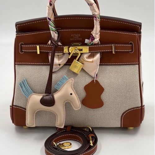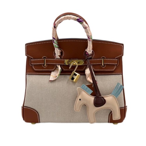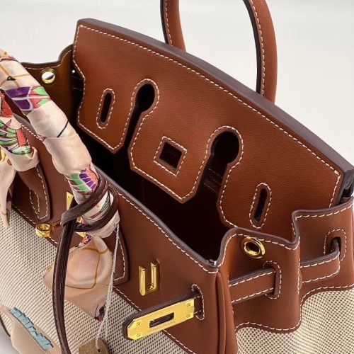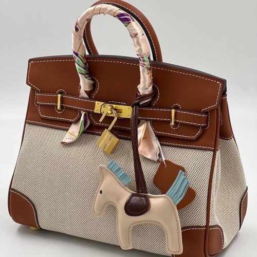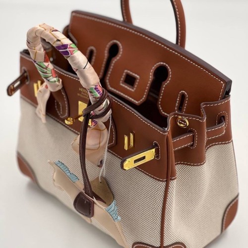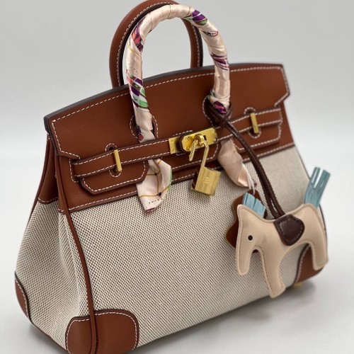 Коричнево-бежевая сумка Hermes из текстиля и натуральной кожи. Фурнитура золотистого цвета украшает аксессуар. Благодаря удобным ручкам сверху и съемному плечевому ремню модель можно носить различными способами. В нашем интернет-магазине вы можете купить копии сумок с доставкой по Москве и по всей России.