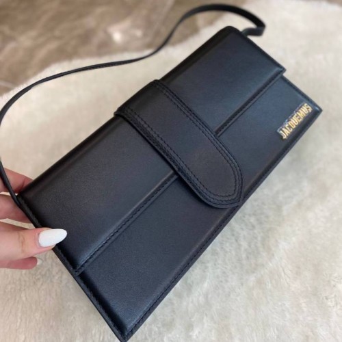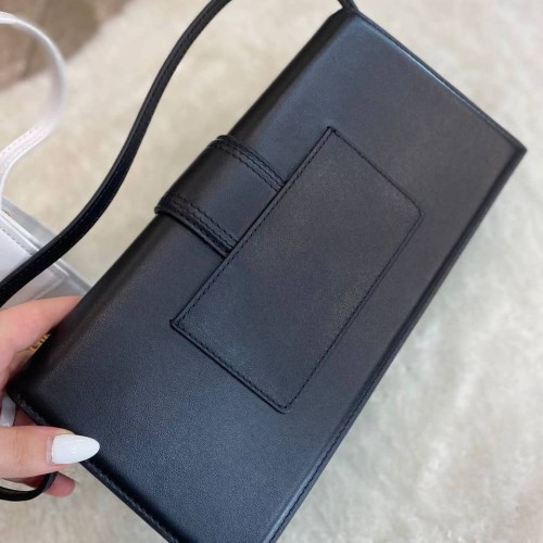 Черная сумка Jacquemus из натуральной кожи. Модель удлиненного силуэта с клапаном на магнитной застежке. Функциональный аксессуар, который дополнит любой образ и выгодно подчеркнет его. В нашем интернет-магазине вы можете купить копии сумок с доставкой по Москве и по всей России.