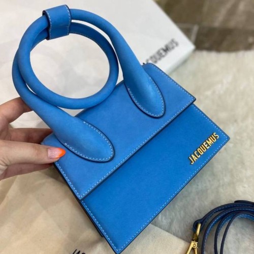 Синяя сумка Jacquemus из натуральной кожи. Практичная модель со съемным плечевым ремнем и оригинальной ручкой. Аксессуар дополнен золотистой фурнитурой и внутренним плоским карманом. В нашем интернет-магазине вы можете купить копии сумок с доставкой по Москве и по всей России.