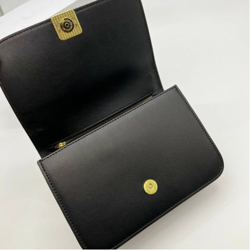 Сумка закрывается на магнитную застежку. Внутри: одно отделение с двумя карманами открытого типа и карман на молнии в клапане.