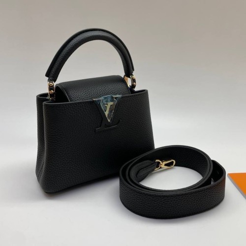 Черная сумка Louis Vuitton Capucines из натуральной кожи. Удобная и вместительная сумка выполнена в классическом черном цвете из мягкой кожи. Комфортная ручка сверху и съемный нерегулируемый ремень позволят носить этот аксессуар в разных удобных вариациях. В нашем интернет-магазине вы можете купить копии сумок с доставкой по Москве и по всей России.