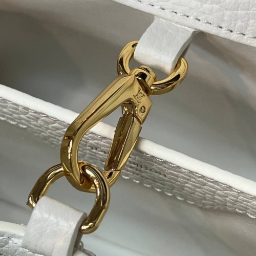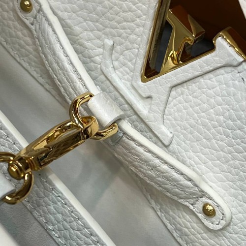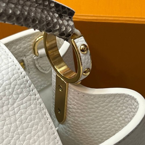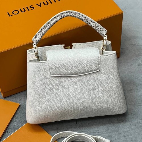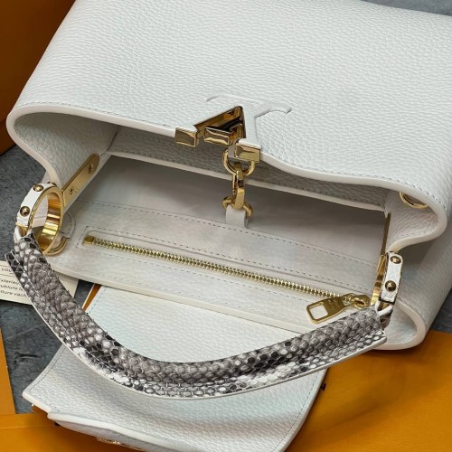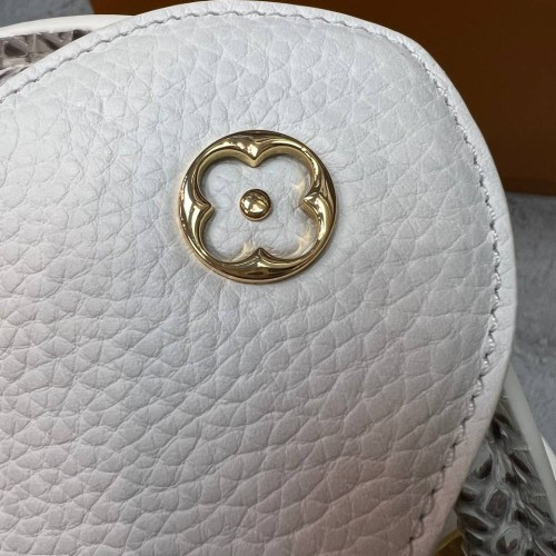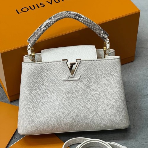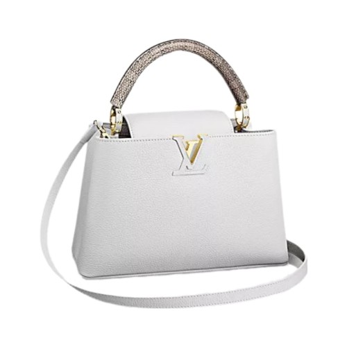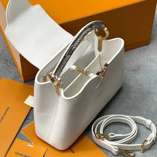 Белая сумка Louis Vuitton из натуральной кожи. Оригинальная модель несомненно привлечет внимание и восхищенные взгляды к вашему образу. Стильная отделка ручки экзотической кожей завершает дизайн аксессуара. В нашем интернет-магазине вы можете купить копии сумок с доставкой по Москве и по всей России.