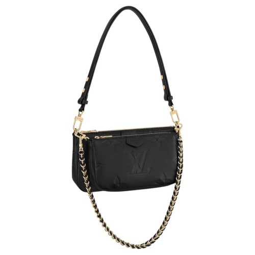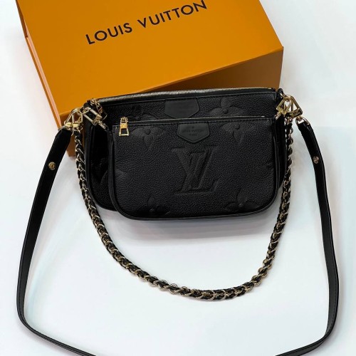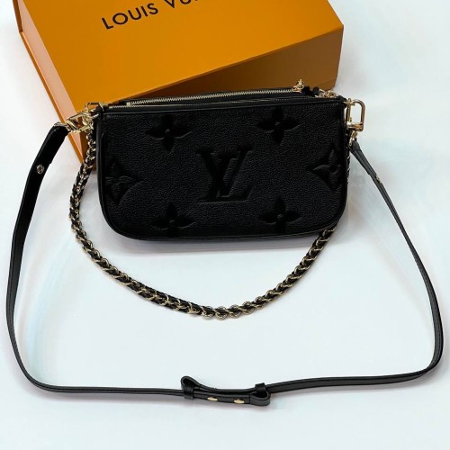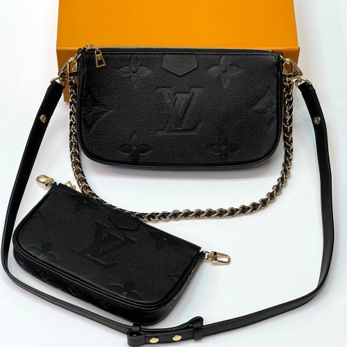 Черная сумка Louis Vuitton Multi Pochette Accessoire из натуральной кожи. Стильная сумка, изготовленная из тисненой кожи, представляет собой образец стиля и функциональности. Оригинальная модель сочетает в себе два съемных клатча, дополненные цепочкой и плечевым ремнем. В нашем интернет-магазине вы можете купить копии сумок с доставкой по Москве и по всей России.