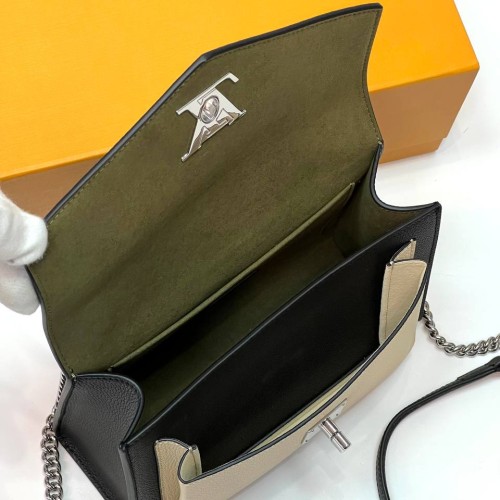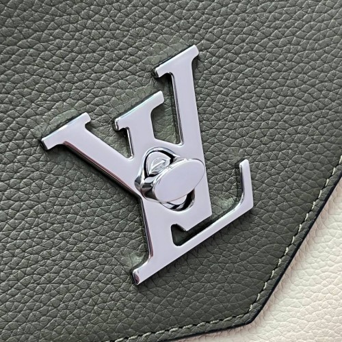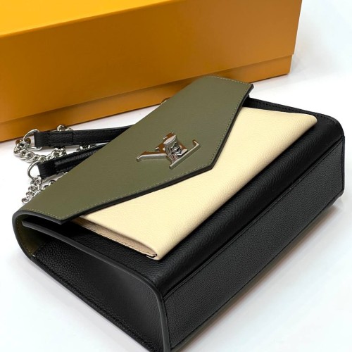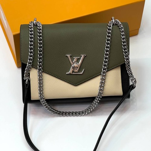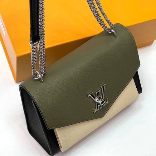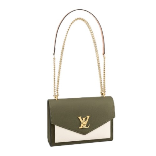 Зелено-бежевая сумка Louis Vuitton Mylockme BB из натуральной кожи. Изящная форма этой утонченной сумки сможет подчеркнуть ваш уникальный стиль. Эта модель выполнена из мягкой и прочной кожи и дополнена длинной металлической цепочкой, позволяющей носить сумку на плече или через плечо, сложив цепочку вдвое. В нашем интернет-магазине вы можете купить копии сумок с доставкой по Москве и по всей России.
