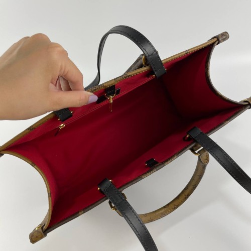 Сумка открытого типа с закрытием на карабин. Внутри: одно отделение с двумя плоскими карманами открытого типа и карманом на молнии.