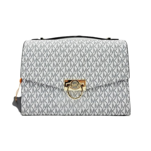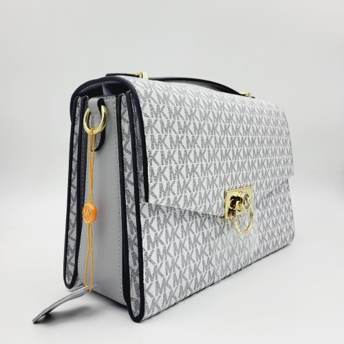 Бело-серая сумка Michael Kors из канвы и натуральной кожи. Стильная модель с монограммой бренда по всей поверхности. Фурнитура золотистого цвета украшает аксессуар и придает ему элегантности. В нашем интернет-магазине вы можете купить копии сумок с доставкой по Москве и по всей России.