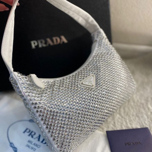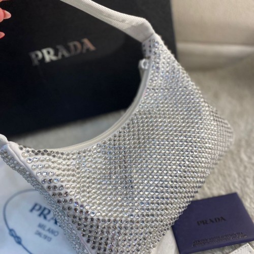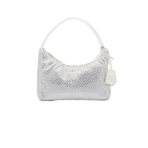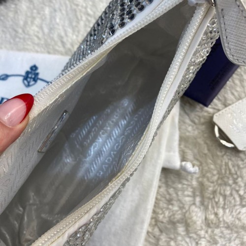 Белая сумка Prada из текстиля. Роскошная модель усыпана кристаллами по всей поверхности. Аксессуар особенно подойдет для вечернего образа. В нашем интернет-магазине вы можете купить копии сумок с доставкой по Москве и по всей России.