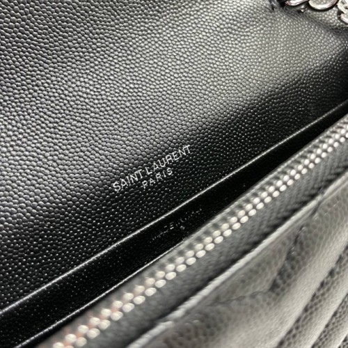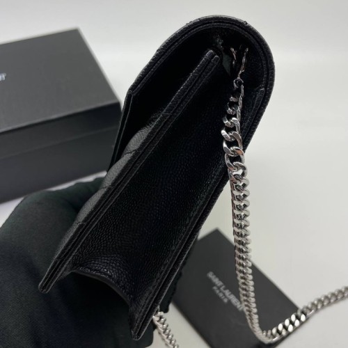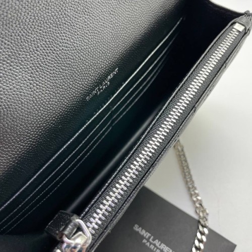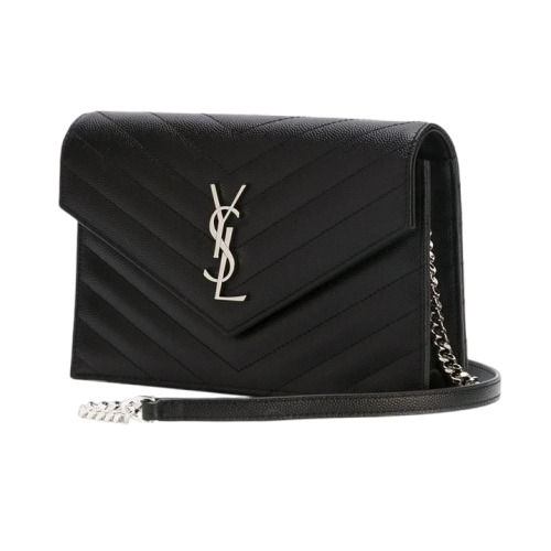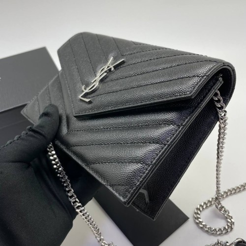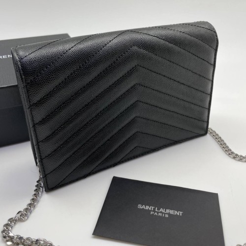 Черная сумка Saint Laurent из натуральной кожи. Клапан украшен монограммой серебристого оттенка. Завершает дизайн аксессуара ремень-цепочка с кожаным наплечником. В нашем интернет-магазине вы можете купить копии сумок с доставкой по Москве и по всей России.