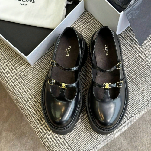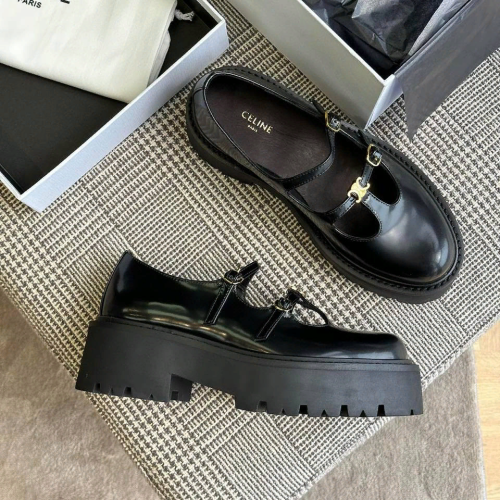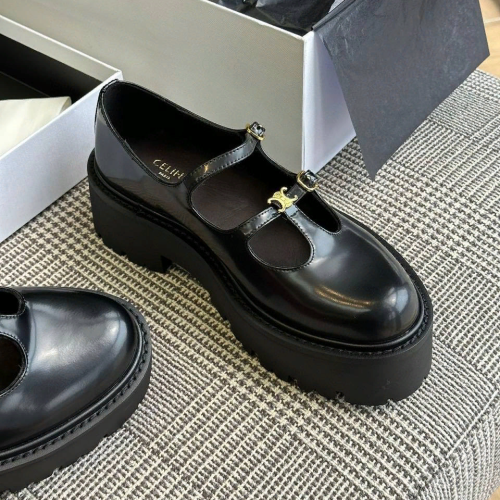Стильные черные туфли Celine из натуральной кожи. Обувь сделана на массивной подошве с каблуком, а сверху имеются ремешки, которые регулируются. Данная пара может стать акцентом вашего образа. В нашем интернет-магазине вы можете купить копии туфель с доставкой по Москве и по всей России.
