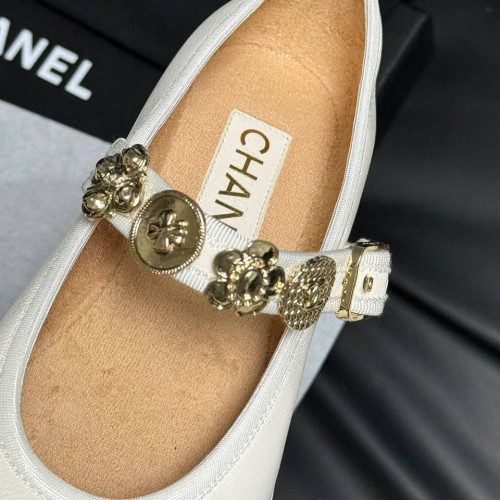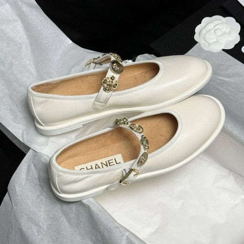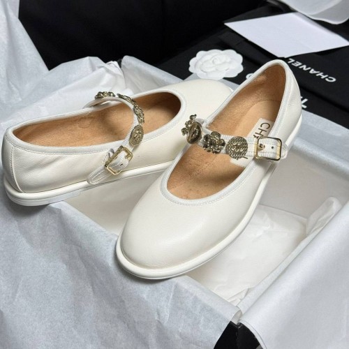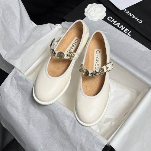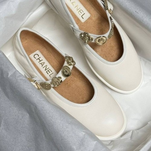 Белые женские туфли Chanel Mary Janes из качественной натуральной кожи. Стильная модель с ремешком для фиксации стопы украшена золотистым декором. Классика для создания элегантных образов. В нашем интернет-магазине вы можете купить копии туфель с доставкой по Москве и по всей России.