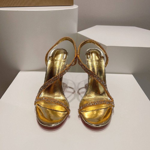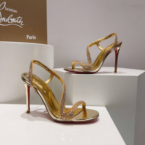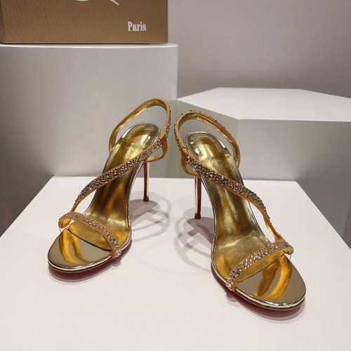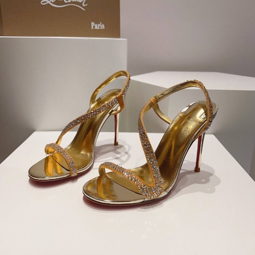 Золотые туфли от Christian Louboutin из натуральной кожи. Туфли на элегантной шпильке 10,5 см изящно украшены мерцающими кристаллами. Задник заменили узким ремешком, поэтому пара выглядит невесомой. Высокие шпильки зрительно удлиняют ноги и придают женственности. В нашем интернет-магазине вы можете купить копии туфель с доставкой по Москве и по всей России.