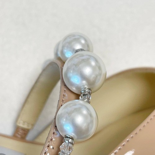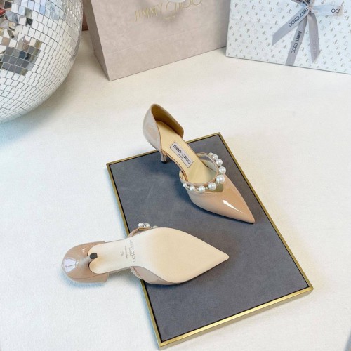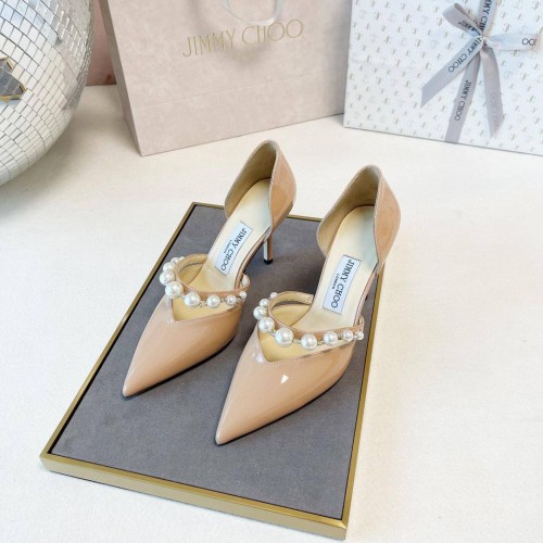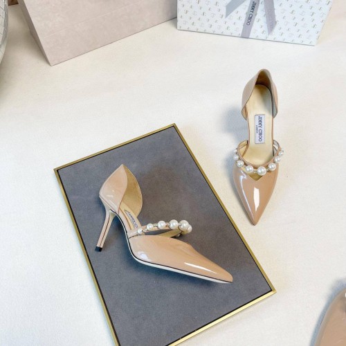 Бежевые туфли Jimmy Choo из гладкой лакированной кожи. Острый носок и декор из искусственного жемчуга не оставит вас равнодушной. Туфли имеют устойчивый каблук 8,5 см и анатомическую форму подъема, за счет чего ножки не устают даже после длительной прогулки. В нашем интернет-магазине вы можете купить копии туфель с доставкой по Москве и по всей России.