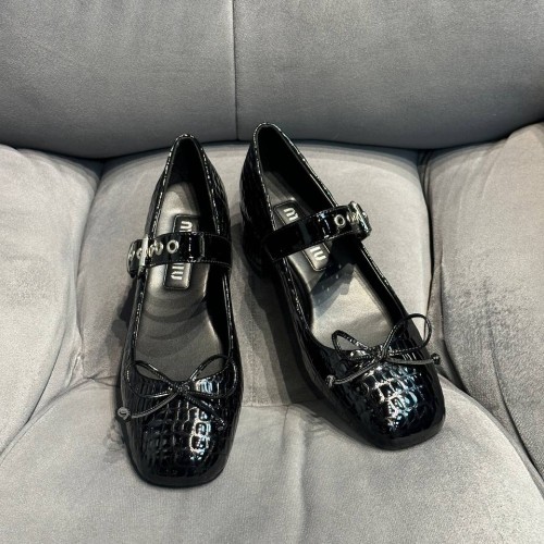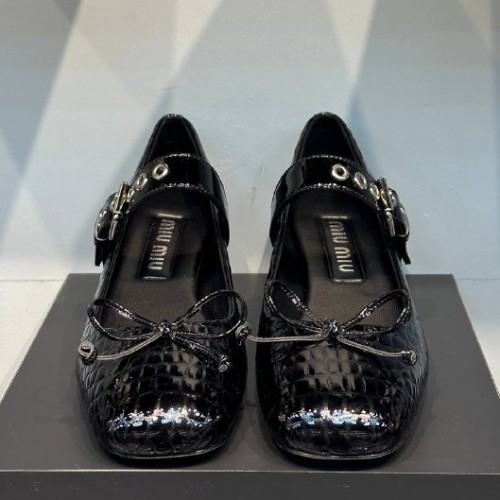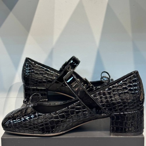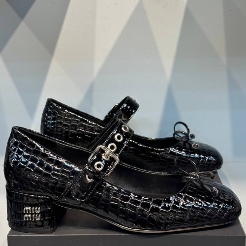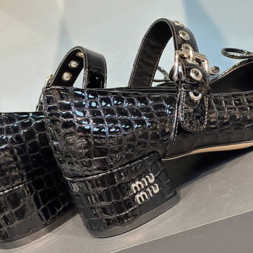 Черные туфли Miu Miu из лакированной кожи. Идеальная выделка кожи под крокодила и каблук 3,5 см. Обувь способна произвести впечатление. Союзка с металлическими застежками и элегантный кожаный бант в дизайне обуви не оставит вас равнодушной. В нашем интернет-магазине вы можете купить копии туфель с доставкой по Москве и по всей России.