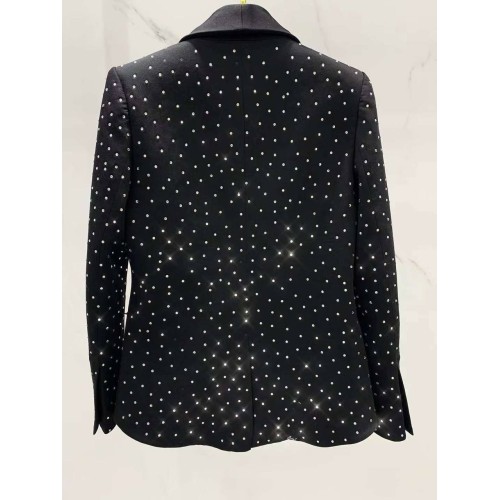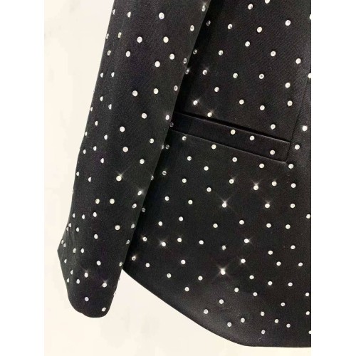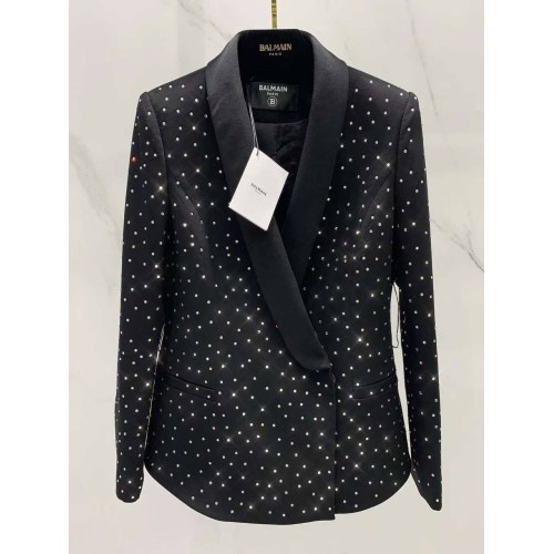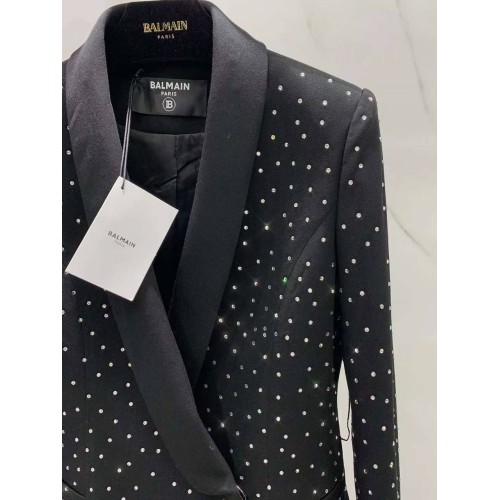 Жакет Balmain черного цвета. Спокойный черный оттенок приглушает яркость, делая образ более строгим и элегантным. Изделие расшито кристаллами, которые эффектно смотрятся в движении, когда на них падает свет. В нашем интернет-магазине вы можете купить копии жакетов с доставкой по Москве и по всей России.